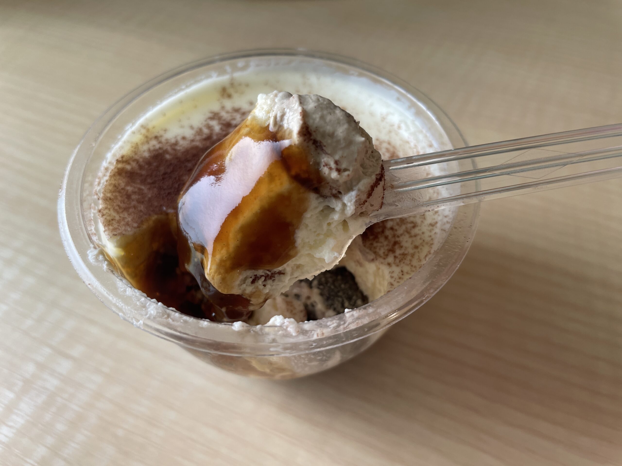 セブンイレブン新作「ティラミスわらび餅」は、まず、スプーンを入れた時の感触は、ティラミスムースが驚くほど柔らかいです。