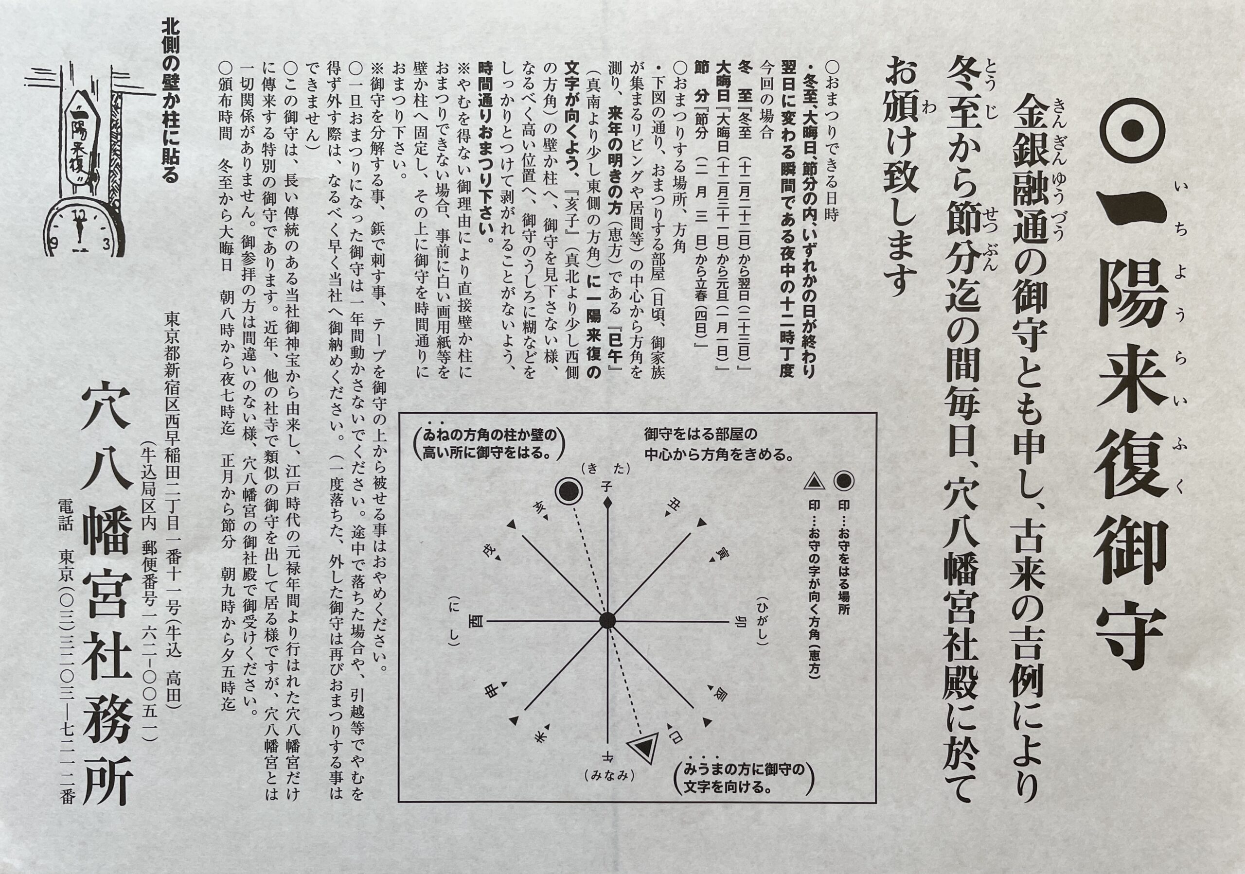 2026年版の穴八幡宮の一陽来復御守の日程や方角・貼り方についてまとめました。