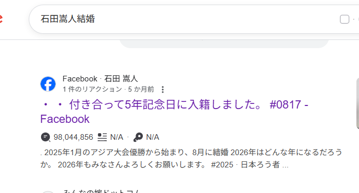 ネットで石田さんの名前を検索すると、Facebookの「付き合って5周年記念日に入籍しました」という幸せいっぱいの投稿が出てくることがあります。