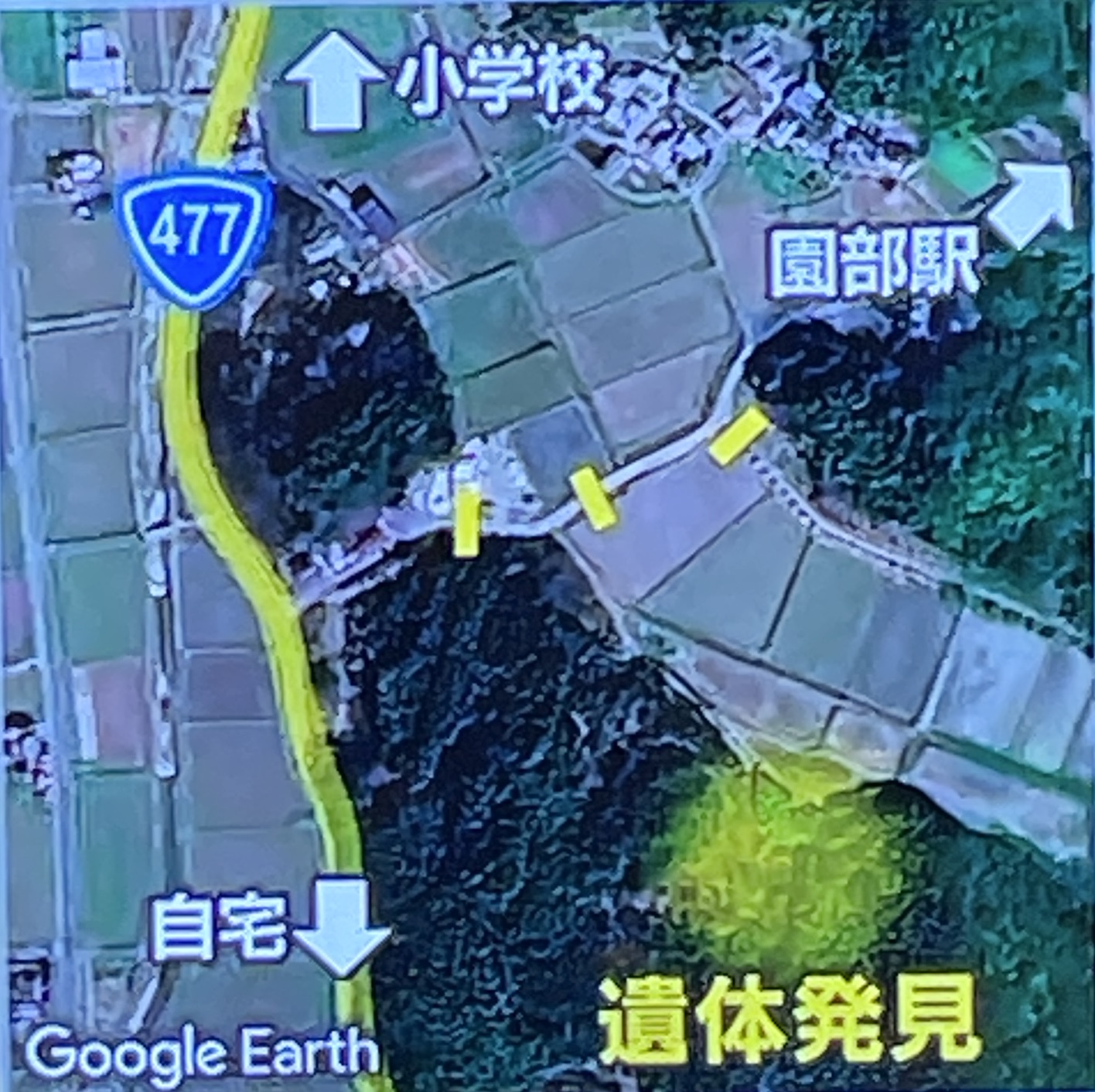 - 遺体は園部小学校から南西約2kmの山林(寺の周辺)で発見。