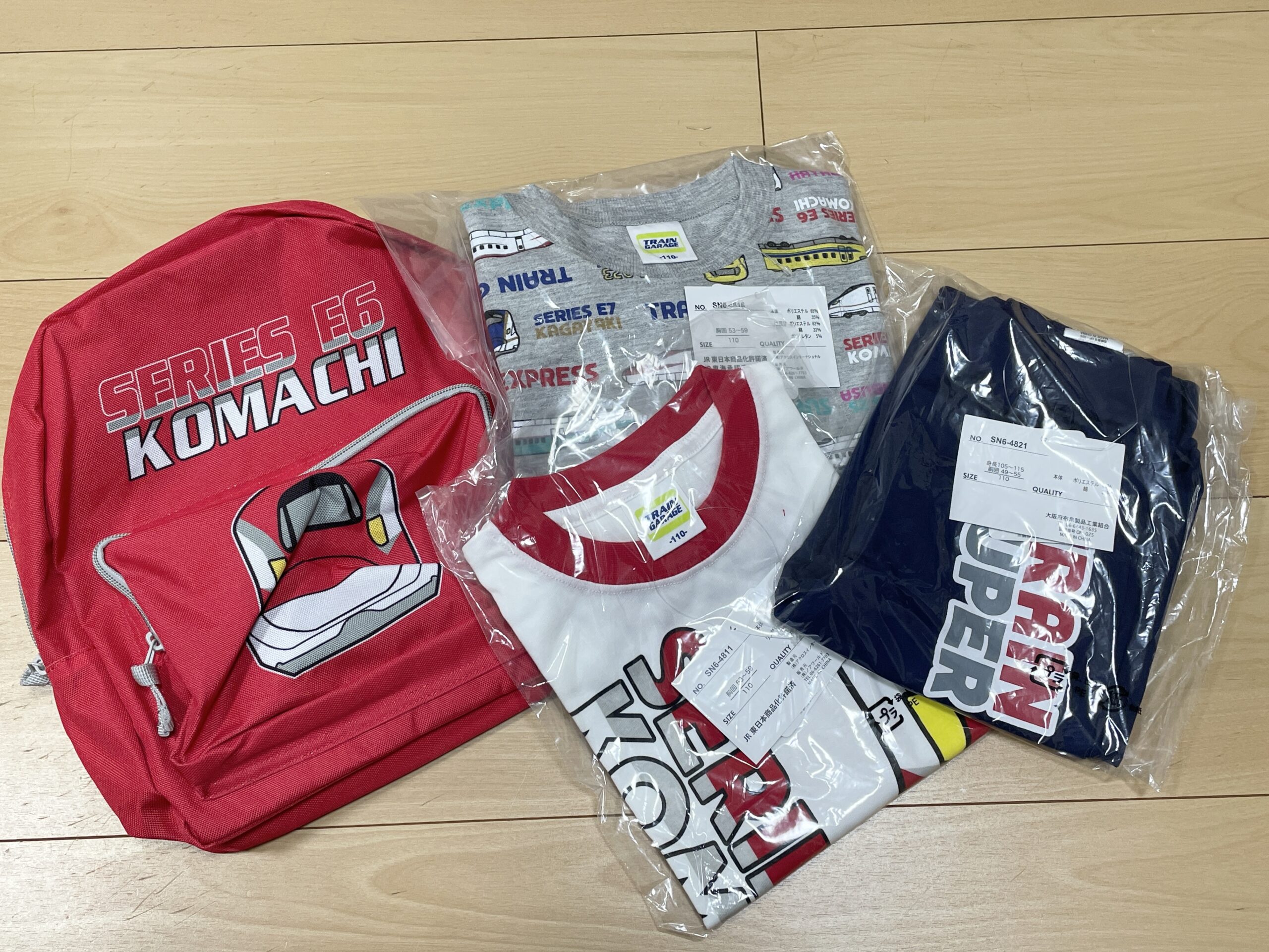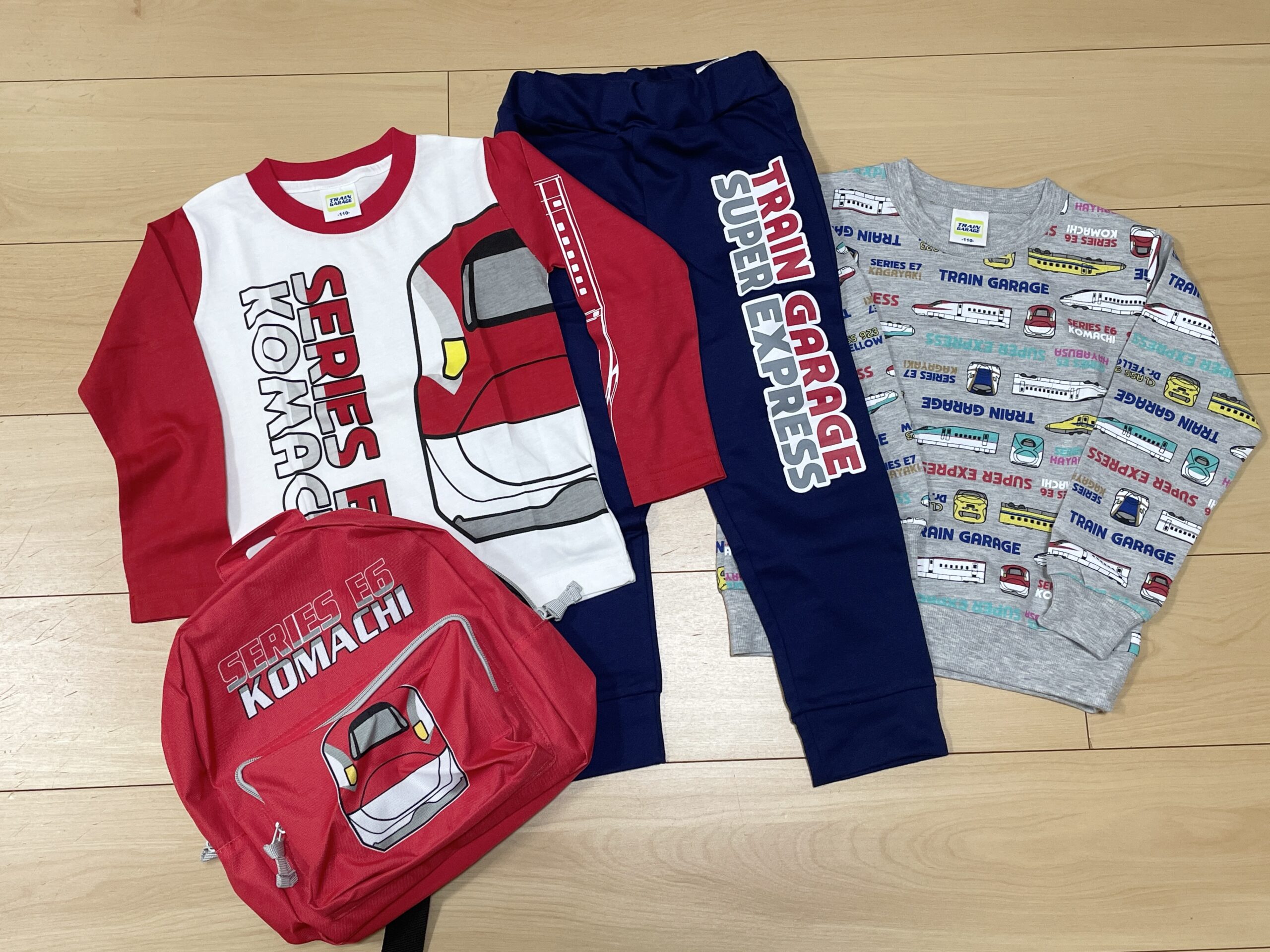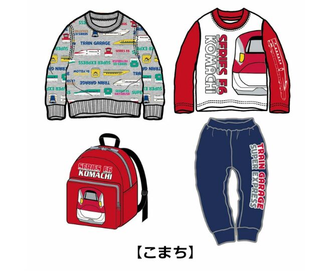 - こまちリュック、裏起毛トレーナー、長袖Tシャツ、ロングパンツの計4点がセットになっていました。